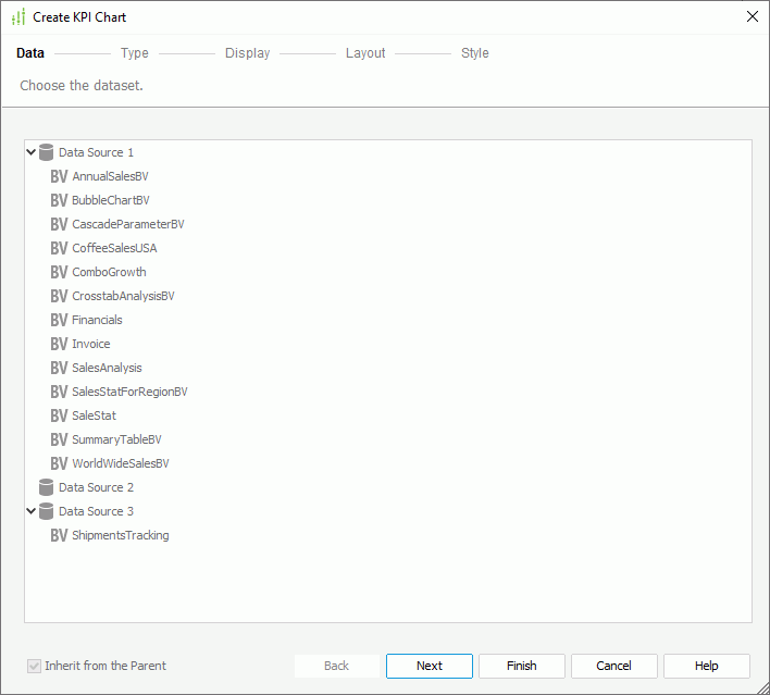 - In the Choose Data dialog box, specify the dataset you want to bind with the KPI and select OK.
