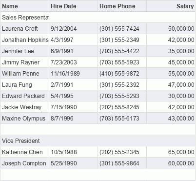 Suppose that you have created a table of Group Above type in a page report in the catalog SampleReports.cat saved in <install_root>\Demo\Reports\SampleReports. The table uses the query EmployeeInformation in Data Source 1 of the catalog, displays Name, Hire Date, Home Phone, and Salary, is grouped by Employee Position in Ascend order, and applies the LogiReportDemo style. Since you do not set any group filter condition, there are three groups in the table: Marketing, Sales Representative, and Vice President.