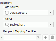 - In the Recipient section, specify the recipient addresses. The data fields that define recipient information in the specified query are available in the drop-down lists. For example, to distribute the report to email addresses, select E-mail and then double-click a data field that defines email addresses from the drop-down list.