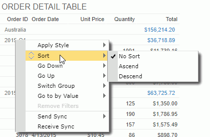 If a detail/summary field value is clicked on, the sorting will affect the order of detail/summary records in the table; if it is a group field value, the order of groups in the group level represented by the group field will be rearranged. To remove the sort condition, select No Sort.